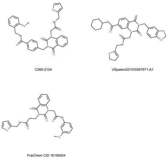 The data obtained in the present study show that some of the tested compounds affect mostly or only the penetration rates most probably due to muscle contraction/behavioral disruption [96,97]. These results suggest that some of these substances, although not affecting mortality, may change the nematode behavior and its sigmosoidal crawling [96]. Among these tested compounds, C260-2124, was found as presenting the required anti-nematode characteristics. After examination of chemical literature and patents data, this compound is not referenced for any biological assays. Only few similar compounds were found presenting some biological action. The two closest ones (Tanimoto index around 0.7) are presented in Figure 16: the first one is described in PubChem (MLS00073044 and CID 16195204) and was tested in bioassays against the protein target huntingtin (Huntington disease) and the second compound was described in US patent 2010/0267671A1 to modulate apoptosis in cells.