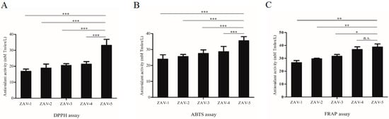 Total antioxidant activity of Zhenjiang aromatic vinegar (ZAV) measured by three different assays. (A) DPPH assay, (B) ABTS assay, (C) FRAP assay. All data are expressed as mean ± S.D. (n = 6). * p < 0.05, ** p < 0.01, *** p < 0.001 vs. ZAV-5, n.s. indicates no significant difference.