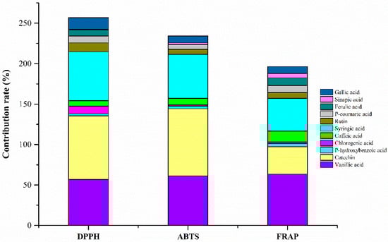 According to the contents of phenolic compounds measured by HPLC, the model solution of phenolic compounds was prepared with standard substances. A kind of phenolic compound was deleted from the model solution, and then antioxidant activities of residual solution were determined by DPPH, ABTS and FRAP methods. The results were calculated as follows: Contribution rate of missing substance (%) = ((Antioxidant value of model solution − antioxidant value of residual solution)/Antioxidant value of model solution) × 100%.
