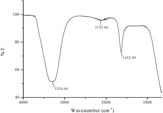 FTIR analysis was carried out to identify the presence of flavanones and terpenoids in the Azadirachta indica leaf extract which are accountable for the stabilization of iron oxide nanoparticles. The representative FTIR spectra of pure Azadirachta indica leaf extract and the synthesized Fe3O4-NPs are manifested in Figure 1 and Figure 2. The strong stretching band appear around 3324 cm−1 (Figure 1) shows the presence of N-H stretching and bending vibration of amine group NH2 and OH the overlapping of the stretching vibration of attributed for water and phenolic group of Azadirachta indica leaf extract molecules. After reduction, the decreases in intensity at 3433 cm−1 imply the involvement of phenolic group of Azadirachta indica in the reduction process.