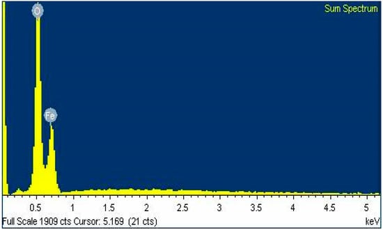 The presence of Fe (iron) and O (oxygen) with atomic percentage of 33.29% and 66.71% respectively was confirmed by EDX microanalysis (Figure 6). The presence of nanocrystalline elemental iron was confirmed by the distinctive peak, which was observed approximately at 0.6 keV. EDX spectra inferred the presence of elements Fe (iron) and O (oxygen) and thus confirmed the chemical composition of Fe3O4 nanoparticles.