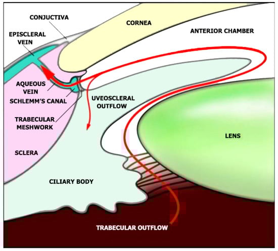 Glaucoma, a disease characterized by neurodegeneration which affects the retinal nerve fiber layers and the optic nerve head, is considered as one of the world’s leading causes of visual impairment. It is projected that by 2040, 111.8 million people worldwide will have the disease [,]. Amidst numerous subtypes, primary open-angle glaucoma (POAG) is the most typical type []. An important pathological risk for primary open-angle glaucoma is the degree of the intraocular pressure (IOP) []. The IOP is generated within the eye’s anterior chamber by resisting aqueous humor evacuation from the trabecular meshwork (TM) and the inner wall of the Schlemm’s canal (SC) (Figure 1) [,].