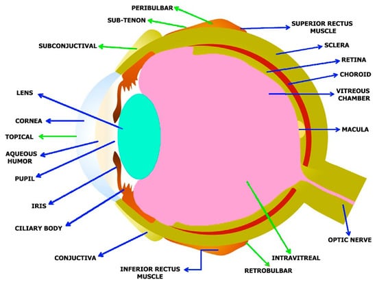Anatomy of the human eye and administration routes for both nano based medicines and traditional drugs: Blue arrows indicates various eye structures and the green arrows indicate the various administration routes.