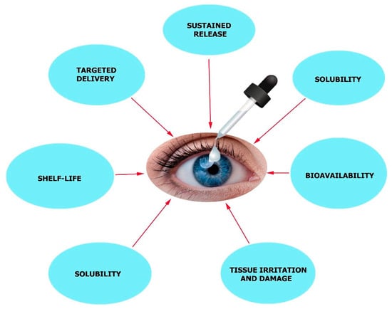 The environment in the human eye has two major walls—the blood-aqueous and blood-retina walls. The former wall encloses the ciliary body’s pigment-less epithelium, which contains the Schlemm’s canal endothelium, iris epithelium, and the iris vessel endothelium. Cellular transports are controlled by the cell junction encompassing both the para and active types [,,]. The latter barrier is fragmented into two, i.e., the outer layer and inner layer. The inner blood-retinal barrier carries the retinal vascular endothelium with tight junctions, while the outer blood-retinal barriers have a single layer of retinal pigment epithelium (RPE) with tight junctions [,]. The mentioned fragments constrict molecular penetrations into the intraocular chamber, leading to a deficiency in intraocular tissue treatment. Additionally, site-based drug delivery on the anterior ocular section is usually restricted by a corneal surface clearance mechanism and other pre-corneal elements, which could be the blinking of the eye, solution discharge, tear turnover, and film eye tearing []. The tear film of the human eye has a quick restoration period of about 2–3 minutes. Therefore, many site-based delivery drugs will be cleaned out in a short time after installation, e.g., precisely 2-3 minutes. If the drug solution which is topically applied is greater than 30 μL (the volume of the upper limit quartered in the cul-de-sac), a vast majority of drugs used may either be emptied by gravity-induced discharge or nasolacrimal drainage. Due to these obstacles and factors, the total drug efficiency of the medicine given is considerably less than 5%, thus rendering the bioavailability low [,].