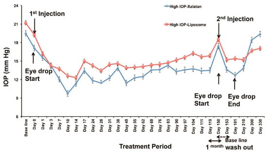 Comparative analysis between Xalatan eye drops and Latanoprost-loaded liposomes administered via the subconjunctival route in nonhuman primates. A great reduction of intraocular pressure was observed when a single injection of Latanoprost-loaded liposomes was done via the subconjunctival route for a period of 120 days in comparison with Xalatan eye drops. After a second injection, the intraocular pressure reduced further over another period of 180 days. Reproduced from [] with permission from the American Chemical Society.