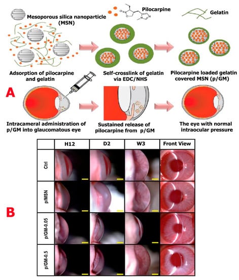 (A) Pilocarpine-loaded gelatin-covered mesoporous silica nanoparticles (p/GM) designed to reduce intraocular pressure. (B) Time-course slit-lamp biomicroscopy images of rabbit eyes injected with p/MSN, p/GM-0.05, and p/GM-0.5. After pilocarpine injection, the observation times are indicated as H12, D2, and W3 on a scale bar of 4 mm. Reproduced from [] with permission from The Royal Society of Chemistry.