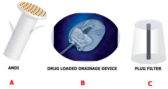 Devices are mostly used in the drainage of glaucoma when trabeculectomy and IOP-lowering medication prove inefficient [,]. The mentioned devices give a different route for the aqueous humor to the collection plate beneath the conjunctiva from the anterior section of the eye. Those made by Ahmed, Molteno, Krupin and Baerveldt are the major devices commercially available for glaucoma draining [,,]. Despite the fact that some differences exist between them, for example, their shape, size of plates, composition, and rigidity, they have successfully been able to contain and regulate IOP (within a period of five years) and there were no noticeable differences in vision preservation. Additionally, no noticeable differences were spotted in the total incidence of suprachoronical hemorrhage, postoperative hypotony, plate surrounding fibrosis, and inflammation []. Fibrosis is the main reason for the overall success decrease in five years from 40% to 50% in drainage implants. Even if antimetabolite injections like mitomycin C (MMC) and 5-fluorouracil (5-FU) have been found to both post and intraoperatively reduce complications [], administration of injections to the bleb still causes a risk of infection and discomfort in patients. However, if the drainage device can be coated and used as a delivery vehicle, it could potentially have a greater effect on drug delivery systems (Figure 8B). Ponnusamy et al. [] successfully manufactured a film of polylactic-co-glycolic acid (PLGA) with two layers which were loaded with 5-FU and MMC for drug release at a continuous rate. The studies conducted in vitro reported MMC was only stable on the surface, so 5-FU was loaded at the bottom. 5-Fluorouracil indicated to be released after three to five days continuously until day 28. After five days, the information obtained showed cell proliferation was inhibited by a COS-I cell culture model. This gives a promising use of glaucoma devices as an inflammation and fibrosis prevention method.