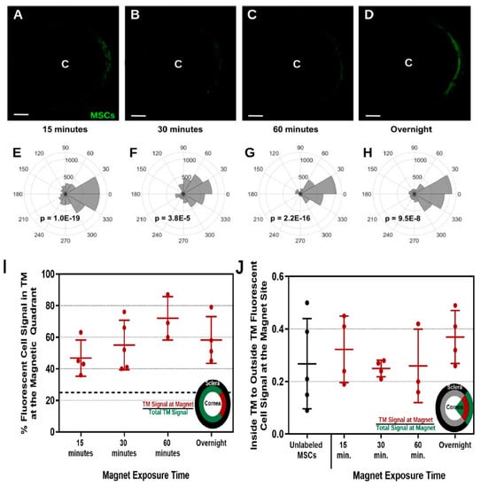 Outcome of Magnetic Field Exposure Time on directing 200 nm PBNC-MSCs to the trabecular meshwork. Figure (A–D) Shows anterior segment of the eye post mesenchymal stem cell delivery. There were bar magnets around the limbal region with *C* indicating the center of the human cornea. Figure (E–H) shows the intensity of total fluorescence within the trabecular meshwork area. P-values were calculated by means of Kuiper’s V test to evaluate if distribution was non-uniformly skewed in the direction of the focus of the magnet (0°). (A,E) 15 mins (n = 4 eyes), (B,F) 30 mins (n = 5 eyes), (C,G) 60 mins (n = 3 eyes), and (D,H) overnight (n = 4 eyes) with its exposure to the magnet are presented. Figure (I) indicates the percentage of fluorescent cell signal in magnetic quadrant in the trabecular meshwork, defined as the section encompassing 45° to −45°. The dotted line designates the expected value should there have been uniform cell delivery to the entire circumference of the TM (25%). Figure (J) Trabecular region fluorescence signal in comparison with non-trabecular fluorescent signal within the zone encompassing −45° to +45°. All evaluations between groups were not significant (p > 0.05) using one-way ANOVA with post hoc Tukey survey. Adapted from [] with permission from Scientific Reports.