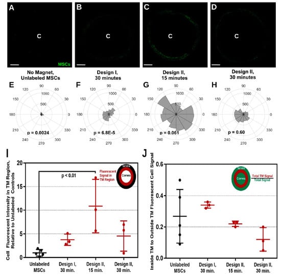 360° delivery of PBNC-MSCs using ring magnets. Figure (A–D) denotes injection of PBNC-MSCs into eyes by placing two types of ring magnets nearby the circumference for a diverse period of time with *C* indicating the center of the human cornea. Figure (E–H) shows the intensity of total fluorescence within the trabecular meshwork area. P-values were calculated by means of Rayleigh’s test to evaluate uniform delivery to the circumference (p < 0.05 denotes non-uniform delivery). Figure (A,E) no magnet (n = 5 eyes), (B,F) Magnet Design I for 30 mins (n = 3 eyes), (C,G) Magnet Design II for 15 mins (n = 3 eyes), and (D,H) Magnet Design II for 30 mins (n = 3 eyes). Figure (I) Cell signal quantification in the trabecular meshwork from injected mesenchymal stem cell eyes. Figure (J) Delivery of MSC specifically to the TM. Error bar indicates standard deviation with significant differences (p < 0.05) between groups calculated using post hoc Tukey analysis with ANOVA. Adapted from [] with permission from Scientific Reports.