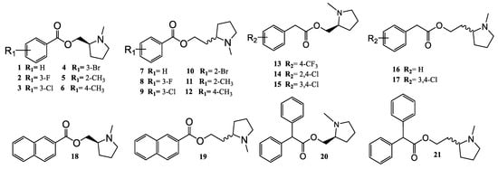The arylpyrrolidine ester derivatives, compounds (1–21) (Figure 3) were synthesized from the following commercially available compounds: benzoic acid and 2-phenylacetic acid derivatives, 2,2-diphenylacetyl chloride, 2-Naphthoyl chloride, (S)-(-)-(1-methyl-2-pyrrolidinyl)methanol, and (±)-2-(1-methyl-2-pyrrolidinyl)ethanol.