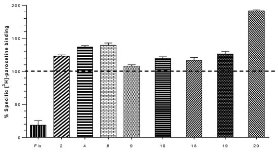 Binding experiments for h-SERT show that all compounds are unable to displace [3H]-paroxetine from its binding site, but unexpectedly, an increase of radioactivity of over 100% was found for some values of paroxetine binding. These increases in the binding of the radioligand did not exceed 40% in most of cases. However, compound 20 elicited an increase of 91% of the total radioactivity binding, indicating a possible allosteric interaction of this compound, which could be responsible for the increase of total [3H]-paroxetine bonded at the h-SERT binding site (Figure 4).