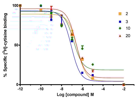 Compounds effects on binding of [3H]-cytisine to α4β2 nAChRs. Data points represent the mean ± SEM of four experiments, each one carried out in triplicate. The radioligand concentration in all displacement studies was 1 nM.