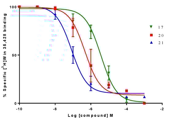 Compounds 18 and 19 were less potent than compounds 16 and 17 at h-DAT, indicating that the incorporation of a naphthyl moiety (compounds 18 and 19) decreases the affinity for this target (Figure 6). On the other hand, the ethylene linker connecting the pyrrolidine moiety and the aryl ester in 16 and 17 improved the affinity as compared with compounds 13, 14 and 15 (not included in Table 1) which contained a methylene linker.