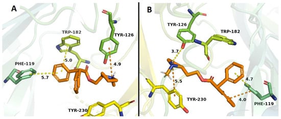 Binding modes of compound 20 (A) and compound 21 (B) to the human α4β2 nAChR. The orange-ligands denotes compounds 20 and 21. Dotted lines correspond to the different interactions which may take place in the ligand–receptor complexes.