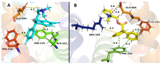 The binding studies carried out in SERT that all compounds were unable to displace [3H]-paroxetine from its binding site, but unexpectedly compound 20 exhibited an increase of the radioactivity, indicating a possible allosteric interaction in SERT. Docking studies are in line with this result, mainly due to the presence of an ionic bond and π-stacking interactions between the quaternary nitrogen with Glu 494 and Phe 335 residues, respectively. These interactions would take place in both compound 20 and the S-citalopram co-crystallized with SERT (Figure 8B). Additionally, compound 20 exhibited the highest affinity in the allosteric h-SERT binding site, probably due to a new π-stacking interaction between one of the phenyl group of 20 with Phe 556 and a π–cation interaction between the phenyl group of 20 and Arg 104 residue, which were not observed in the S-citalopram co-crystal (Figure 8B).