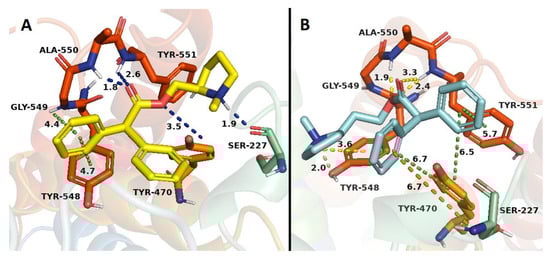 Binding studies in h-DAT indicate that only 6 compounds (1–21) showed affinity values at the central binding site of h-DAT. The results from the docking studies correlated with experimental evidence, primarily due to the presence of a π–π interaction between the aromatic group of compounds 18, 19 and 20 and the Tyr 548 residue, and a π–cation interaction among the phenyl groups of compounds 16 and 19 with the quaternary amine of Ala 550, both interactions retained for neo-nicotinic compounds and bupropion. Compound 17 showed a double hydrogen bond interaction, among Tyr 470 residue with the quaternary nitrogen of the N-methylpyrrolidine and the ester function of 17, with both interactions absent in bupropion. Compound 21 showed the highest affinity in relation to bupropion. This experimental value can be supported by the docking results, on the basis of the following interactions observed: a π–π type interaction between both phenyl groups and Tyr 470 residue, a π–π interaction between one of the phenyl group and Tyr 551 residue, and two π–cation interactions between the phenyl groups with Ser 227 and Tyr 548 residues. On the other hand, compound 21 showed a hydrogen bond interaction between the quaternary amine group of N-methylpyrrolidine and Tyr 548 residue, and three hydrogen bond interactions between the ester function of 21 with Ala 550 and Tyr 551 residues, contributing in consequence to the thermodynamic stability of the system (Figure 9B).