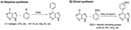 The classical methods for the preparation of purines bearing aryl substituents are based on heterocyclization; however, the cyclization methodology usually requires multistep procedures. Consequently, the synthesis of the target aryl purines afforded only moderate to low yields []. The recent methods for the synthesis of aryl-substituted purines involve the transition metal-catalyzed cross-coupling reactions of aryl organometallics (Ar-M) with halopurines (Scheme 1A) [,]. For example, Suzuki–Miyaura [,,,,,,,,], Stille [,], Negishi [], and Kumada [] coupling reactions have been frequently used for the preparation of aryl-substituted purines. Indeed, these approaches represent versatile and reliable synthetic methods; however, these coupling reactions require stoichiometric amounts of metallic reagents and the protection of the nucleophilic functional groups—such as the hydroxyl and amino groups—in the substrates. Hence, direct arylation of 6-chloropurines by electron-rich arenes using a three-fold excess of aluminum chloride (AlCl3) was reported by Guo’s group as an alternative method for preparing aryl purines in a short synthetic step (Scheme 1B) [].