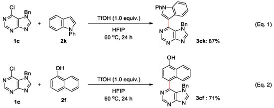 One of the significant advantages of the present reaction system is the production of structural and sterically diverse N-7-substituted 6-arylpurines; these arylpurines are not easily accessible by other synthetic methods [,,]. As a result, the proposed reaction conditions were also utilized for the coupling of 7-benzyl-6-chloro-7H-purine 1c with indole 2k and naphthalene nucleophile 2f to afford the corresponding 6-arylated N-7-substituted purines 3ck and 3cf in good yields (Scheme 3).