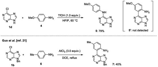 When using p-anisidine 4 as a substrate, our reaction system with TfOH became valuable for the chemoselective N-arylation of halopurines at the 6 position under mild temperature (Scheme 4) []. We subjected 9H-chloropurine 1d and aniline 4 to our optimized conditions at 60 °C, obtaining selective N-arylation that smoothly provided N-(4-methoxyphenyl)-9H-purine-6-amine 5 in 79% yield, without the formation of the C-arylated purine coupling product 5′. On the other hand, Guo’s group previously reported the reaction of purines and anilines or naphthylamines in the presence of a three-fold excess of AlCl3 in DCE, which alternatively gave the C-arylated coupling products and likewise the biaryl 5′ []. Therefore, our reaction system is complementary to the AlCl3-mediated coupling reaction [] for the syntheses of C6-aryl-substituted purine derivatives in view of product selectivity.