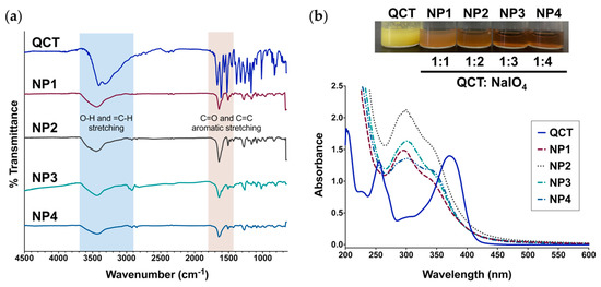 (a) FT-IR spectra of QCT and the NPs prepared in this study showing the characteristic bands for O-H stretching (3300–3700 cm−1), C=C-H stretching (2900–3000 cm−1), and C=O/C=C aromatic stretching (1400–1800 cm−1); (b) UV-Vis spectra of QCT and QCT NPs. Top: Aqueous dispersions of QCT NPs synthesized at a QCT:NaIO4 ratio of 1:1, 1:2, 1:3, and 1:4 (NP1, NP2, NP3, and NP4, respectively) next to QCT. UV-Vis revealed a shift in the characteristic absorption bands of QCT after oxidation and NP formation, accompanied by a distinct change in color.