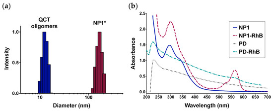 Disassembly of QCT NPs synthesized at a QCT:NaIO4 ratio of 1:1 (NP1) produces oligomers than can be reassembled and loaded with rhodamine B (RhB). (a) Intensity-weighted particle size distribution for QCT oligomers obtained by dissolving lyophilized NP1 in dimethyl sulfoxide (DMSO) compared to reassembled NP1 (NP1*), providing evidence that QCT NPs are formed by noncovalent self-assembly of smaller oligomers; (b) UV-Vis spectra of NP1 and RhB-labeled NP1 (NP1-RhB) showing distinct bands for QCT (270–400 nm) and RhB (500–600 nm). Conversely, RhB-labeled polydopamine NPs (PD-RhB) exhibit broad absorption across the entire UV-Vis region, which limits accurate detection of RhB.