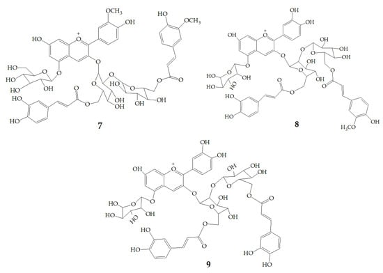 Li et al. [47] identified 13 anthocyanins from purple-fleshed sweet potato cultivar Jihei No. 1 by HPLC-PDA-ESI-MSn. The main anthocyanins were peonidin and cyanidin with 3-sophoroside-5-glucoside acylated with p-hydroxybenzoic acid, ferulic acid, or caffeic acid, among which the content of peonidin3-caffeoylsophoroside-5-glucoside (1) was the highest. Besides, the rare delphinidin-3, 5-diglucoside (2) was identified in the purple sweet potatoes extract. Zhu et al. [35] identified anthocyanins polyphenols and non-anthocyanin polyphenols in purple sweet potatoes extract by HPLC-DAD-ESI-MS2. The results showed that anthocyanins were mainly peonidin3-caffeoyl-p-hydroxybenzoylsophoroside-5-glucoside (3), peonidin3-(6”-caffeoyl-6”’feruloylsophoroside)-5-glucoside (4), cyanidin3-caffeoyl-p-hydroxybenzoylsophoroside-5-glucoside (5). However, the non-anthocyanin molecules are mainly quinic acid, chlorogenic acid, caffeic acid, and chlorogenic acid-3-glucose. Truong et al. [48] identified 17 anthocyanins from stokes purple sweet potato and purple sweet potato NC 415 by HPLC-DAD/ESI-MS/MS, including 1, 3, 5, cyanidin3-caffeoylsophoroside-5-glucoside (6), peonidin-caffeoyl-feruloylsophoroside-5-glucoside (7). There are 12 kinds of pigments in Okinawa cultivars, of which three main anthocyanins are (6), cyanidin3-(6”,6”’-dicaffeoylsophoroside)-5-glucoside (8), and cyanidin3-(6”-caffeoyl-6”’-feruloylsophoroside)-5-glucoside (9) (Figure 1).