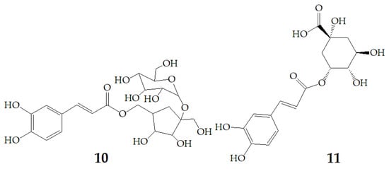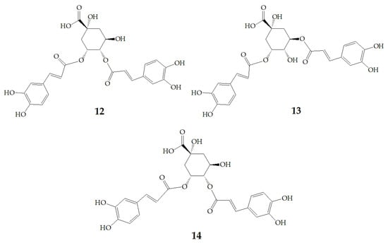 At present, many complex chemical structures of PSPAs have been identified by NMR. Zhao et al. [50] used NMR and HPLC-MS2 techniques to isolate and identify five PSPAs: 6-O-caffeoyl-β-d-fructofuranosyl-(2–1)-α-d-glucopyranoside (10), 5-caffeoylquinic acid (11), trans-4,5-dicaffeoylquinic acid (12), 3,5-dicaffeoylquinic acid (13), 4,5-dicaffeoylquinic acid (14) (Figure 2), and among them, 10 and 14 was found in purple sweet potatoes for the first time.