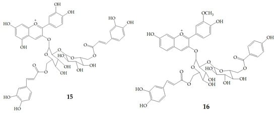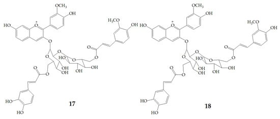 Terahara et al. [52] isolated several new acylated anthocyanins from red vinegar fermented from purple sweet potato. The results of MS and NMR emerged that these acylated anthocyanins including cyanidin3-O-(6-O-(E)-caffeoyl-(2-O-(6-O-(E)-feruloyl)-β-d-glucopyranosyl)-β-d-glucopyranoside) (15), peonidin3-O-(6-O-(E)-caffeoyl-(2-O-(6-O-acyl)-d-glucopyranosyl)-β-d-glucopyranosides) (16), peonidin3-O-(6-O-p-hydroxybenzoyl-(2-O-(6-O-acyl)-d-glucopyranosyl-β-d-glucopyranosides) (17), and peonidin3-O-(6-O-(E)-feruloyl-(2-O-(6-O-acyl)-d-glucopyranosyl-β-d-glucopyranosides) (18) (Figure 3). Six anthocyanin components were identified from Japanese purple sweet potato (Ipomoea batatas cv. Yamagawamurasaki) by nuclear magnetic resonance, mainly composed of the derivatives of cyanidin and peonidin [53,54].
