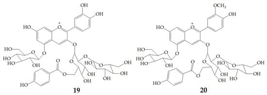 Xu et al. [7] authenticated 12 acylated anthocyanins from purple sweet potatoes P40. After four cooking conditions like steaming, high pressure cooking, microwaving and frying, the total amount of PSPAs decreased by 8–16%, while baking had no significant effect on the total amount of PSPAs. In addition, they also found mono-acylated anthocyanins exhibited better thermal stability than di-acylated and non-acylated anthocyanins, of which cyanidin3-p-hydroxybenzoylsophoroside-5-glucoside (19) had the highest thermal stability. After microwave treatment, the content of 19 in purple sweet potatoes P40 increased significantly from 121 mg/100g to 462 mg/100g, and the content of peonidin3-p-hydroxybenzoylsophoroside-5-glucoside (20) (Figure 4) increased from 19 mg/100g to 87 mg/100g, suggesting that some processing methods may release more anthocyanin monomers from purple sweet potatoes.