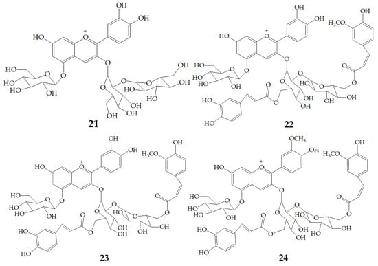 Yoshimoto et al. [13] tested the anti-mutation ability of four different PSPAs including cyanidin3-sophoroside-5-glucoside (21), cyanidin3-(6, 6′–caffeylferulylsophoroside)-5-glucoside (22), peonidin3-sophoroside-5-glucoside (23), peonidin3-(6, 6′–caffeylferulyl-sophoroside)-5-glucoside (24) (Figure 5) with salmonella typhimurium TA98. The results showed that the anti-mutation ability of cyanidin type anthocyanins was stronger than that of peondin type anthocyanins, and the anti-mutation ability of peondin type anthocyanins decreased significantly after diacylation, because the cathecol structure plays an important role in the strong antimutagenicity of anthocyanin pigments. Thus, the purple sweet potato varieties with high content of cyanidin-type PSPAs would be superior as physiologically functional foods.