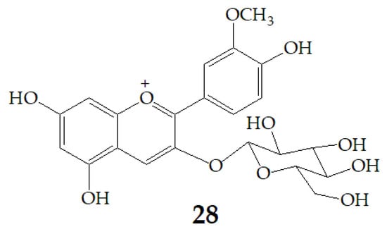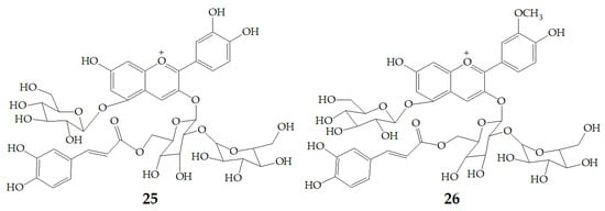 More and more evidences have proved that anthocyanins are beneficial to human health. Different anthocyanins have great differences in stability, absorption, metabolism, and elimination. These differences are important in determining the sites of their impact on health, microbiome interactions, and chemical degradation of their transformation. A research from Kano and co-workers found that PSPAs showed stronger DPPH radical-scavenging activity than anthocyanins from red cabbage, grape skin, elderberry, or purple corn. Moreover, DPPH radical-scavenging activity in urine was increased in PSPAs-injected rats, because the elevation of plasma transaminase activities was depressed. Cyanidin 3-O-(2-O-(6-O-(E)-caffeoyl-β-d-glucopyranocyl)-β-d-glucopyranoide)-5-O-β-d-glucopyranoside (25) and peonidin 3-O-(2-O-(6-O-(E)-caffeoyl-β-d-glucopyranocyl)-β-d-glucopyranoide)-5-O-β-d-glucopyranoside (26) (Figure 6) which were detected in the plasma can protect low density lipoprotein from oxidation at a physiological concentration [67]. Actually, the orally administered PSPAs are directly absorbed and excreted, but the metabolic products of the PSPAs absorbed and the mechanism of action of PSPAs remain to be investigated.