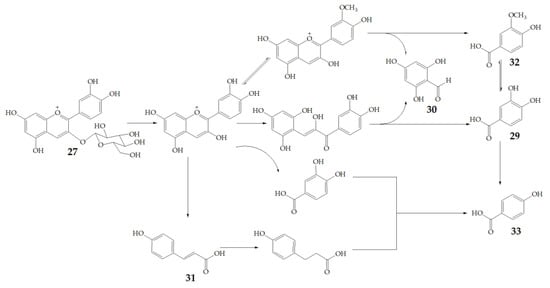Cyanidin-3-glucoside (27) (Figure 7) and peonidin-3-glucoside (28) (Figure 8) are two anthocyanins widely studied at present, and they are the main components in fruits such as blackberry and strawberry [85]. 27 was also widely found in purple sweet potato. Chen et al. [86] studied bacterial-dependent metabolism of 27 under simulated large intestine. It was found that 27 derives chalcone pseudobases and multiform anthocyanins as well as their methylated metabolites, but these substances cannot be absorbed directly by gut microbiota, so they need to be further metabolized into absorbable compounds under the action of gut microbiota. In the process of 27 transformation, protocatechuic acid (29) was the first substance detected. In the detection of 29, researchers also found the existence of 2,4,6-trihydroxybenzaldehyde (30). Surprisingly, after a period of time, two substances, p-coumaric acid (31) and vanillin acid (32) appeared. With the progress of transformation, the presence of p-hydroxybenzoic acid (33) was found after 27 disappeared. The specific transformation steps are in Figure 7. Therefore, the PSPAs can be transformed into specific metabolites that exert a protective effect in the host physiology after intake. Generally, glycosylated PSPAs can be rapidly metabolized by the gut microflora, but some other metabolic processes can also result in their disappearance, for example, some PSPAs metabolites can react with different groups in some macromolecules and then be degraded into some unexpected metabolites.