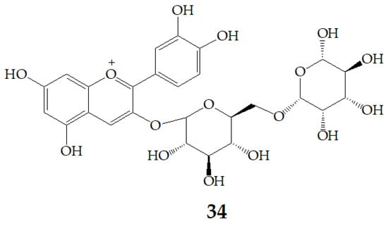 Aura et al. [87] identified 27 and cyanidin aglycone as an intermediate metabolite of cyanidin-3-rutinoside (34) (Figure 9) after fermentation with a 1% faecal flora, which confirmed the deglycosylation of anthocyanins by the gut flora and the presence of deconjugating enzymes. In addition, 27 is deglycosylated. 29 was the main metabolite, and two unrecognized metabolites were formed. These metabolites did not exist in the fecal background or in the samples incubated with inactive bacteria, indicating that anthocyanins were transformed by intestinal microflora, and the metabolism of anthocyanins by bacteria included the cleavage of glycosidic linkages and breakdown of the anthocyanidin heterocycle. Therefore, it is not adequate to predict the health effects of PSPAs by their intact structures, because they can be transformed by bacteria in the colon to smaller phenolic compounds or conjugates of the aglycone, of which health implications are poorly characterized.
