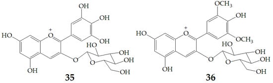 A recent study by Czank et al. [88] using 13C-labelled anthocyanins in humans found that the relative bioavailability of 27 was 12.38 ± 1.38% on average based on the recovered 13C dose, from which 0.18 ± 0.11% of the 13C dose was recovered from blood, 5.37 ± 0.67% from urine, and 6.91 ± 1.59% from breath, whereas 32.13 ± 6.13% of the13C was found in feces. These data indicate that the relative bioavailability of anthocyanins is 2.5% to 18.5% as that of other flavonoid subclasses, such as flavan-3-ols and flavones. The rapid appearance of 27 degradation products and their phase II conjugates within the serum suggests that some degradation may occur in the small intestine (before or after absorption), so the cleavage of the anthocyanin C-ring may not require the action of colonic microflora. Subsequently, Flores et al. [89] investigated the release of anthocyanins and the formation of phenolic microbial metabolites after anaerobic batch-culture fermentation of cyclodextrin (CD) embedded anthocyanins with gut bacteria, and found that the maximum released concentration was 54%, 61%, and 85% for delphinidin-3-glucoside (35), 27 and malvidin-3-glucoside (36) (Figure 10), respectively. The difference of anthocyanin release rate may be related to host–guest interaction which is a function of two key factors. One involves space requirements and depends on the relative size of CD and the size and physicochemical properties of the molecules involved. The second is the thermodynamic interaction between different components of the system. The inclusion complexes of these host-guest systems occur through various interactions, such as hydrogen bonding, van der Waals interaction, hydrophobic interaction, and electrostatic attraction. Different structures of anthocyanins enable them to interact differently with β-CD. The effect of bacterial metabolism resulted in the rupture of glycosidic linkages and cleavage of the anthocyanin heterocycle ring. LC-MS results revealed that gallic acid, ferulic acid, and syringic acid were the main phenolic acids detected when 35, 27, and 36 were respectively fermented.