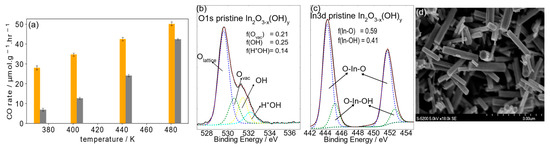 (a) The CO production rate with the In2O(3−x)(OH)y catalyst under white light at 1:1 pressure ratio of H2:CO2 gas atmosphere, and under dark conditions with increasing reactor temperatures. (b,c) The O1s and In3d XPS spectrum of In2O(3−x)(OH)y nanorods as prepared. (d) SEM topographical image of In2O(3−x)(OH)y nanorods.