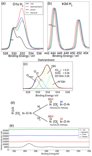 In conclusion, quasi-operando XPS and in situ Hall measurements with the various reactant atmospheres and reactor parameters have provided a new window into the reaction of gaseous H2, CO2, and H2+CO2 with nanostructured In2O(3−x)(OH)y under photochemical and thermochemical operating conditions. While changes in the O1s and In3d core level ionization potentials clearly depict the dissociative adsorption of H2 on the surface of nanostructured In2O(3−x)(OH)y, the results clearly distinguish the homolysis from the heterolysis pathway. These results also show the importance of photoillumination and the reason for In2O(3−x)(OH)y as being a high efficacy photocatalyst, which is to induce greater H2 dissociation and carbonate stability than under thermal conditions. The Hall results show the link between the surface compositional changes with electronic activity, with varying temperature and photo-dependences due to the various populations of chemisorbed species. These results show that surface compositions play important roles in the multiple step process of the RWGS, and can be utilized for various photocatalysts and carbon-based nanocomposites [22,23,24].