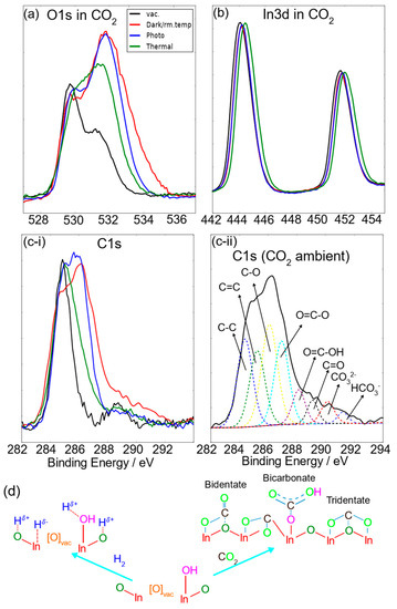 (a–c) The O1s, In3d, and C1s XPS spectrum of In2O(3-x)(OH)y nanorods in H2+CO2 under various reactor conditions in comparison with the pristine surface shown in Figure 1. (c-ii) shows the various carbon species in the C1s spectrum after H2+CO2 under photoillumination conditions.