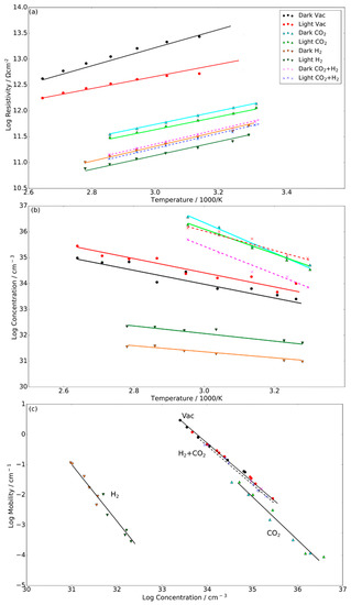 (a) Electrical resistivity and (b) carrier concentration as a function of temperature, with (c) carrier mobility and concentration trends. The results for the vacuum, H2, CO2, and H2+CO2 atmospheres are indicated with circle, downside triangle, upside triangle, and cross markers, respectively. Trend lines are shown as a visual guide, with dotted lines representing CO2+H2 atmospheres.