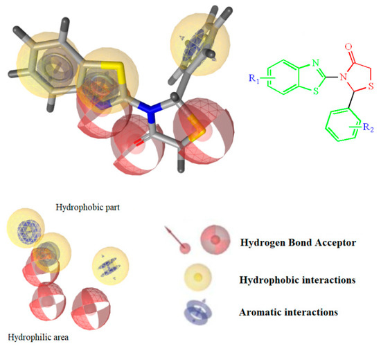 In general, according to docking studies and in vitro results, it seems that the presence of a Cl substituent at the 7-, 6- or 4-position of the benzothiazolyl moiety facilitates an orientation which enables complex stabilization via pi-interactions and hydrogen bond formation involving either the CO group of the thiazolidinone ring or hydrogen acceptor/donor substituents of the phenyl ring. In case of subgroups bearing hydrogen acceptor substituents at the benzothiazole moiety, their involvement in hydrogen bond formation also is favorable for complex stabilization.