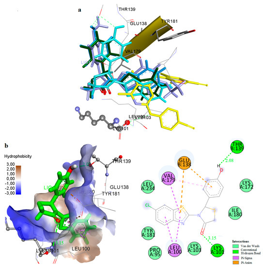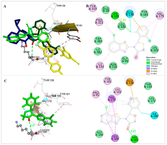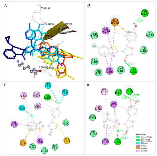 A similar orientation is adopted by several active compounds like compounds 8, 9, the two more active compounds of the subgroup bearing a Cl-atom at position 6 of the benzothiazolyl moiety (R1) (Figure 8A,B,D) and compound 14, the most active compound of the subgroup bearing a Cl-atom at the 4-position of the benzothiazolyl moiety (Figure 8A,D). Among these, compounds 9 and 14 belong in the four more potent out of the thirty-two tested compounds with IC50 values at the nanomolar range. In case of compounds 9 and 14, a hydrogen bond is formed between the CO group of the thiazolidinone ring and Lys101 while a second hydrogen bond is formed between hydrogen acceptor substituents of the 4-position of the phenyl ring and Thr139. An additional hydrogen bond between the H-atom of the 4′-OH substituent and the Glu138 is also formed in compound 14. Pi interactions between the rings of the benzothiazolyl moieties and the amino acids Leu100 and Val179 were observed in all these cases.