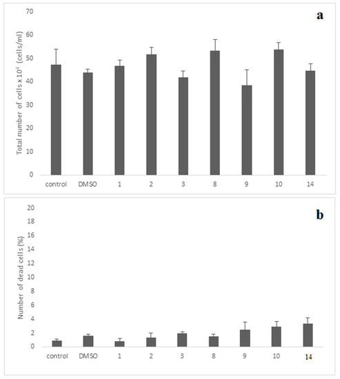 For the evaluation of cellular cytotoxicity of the compounds, the MRC-5 normal cells were incubated for 48 h separately with each compound at the concentration of 10 μΜ. This concentration is much higher than IC50 values of all tested compounds (IC50 0.001 (compounds 9, 10) and 0.01 (compound 14). The evaluation revealed that compounds exhibited no evidence of cytotoxicity against this normal cell line employed, since no statistically significant change was observed with the cell growth to be ≥80% as compared to control-untreated culture (Figure 10a). Importantly, no significant dead cells accumulation was observed in the treated cultures, since their maximum number did not exceed that of 3.3% (Figure 10b).