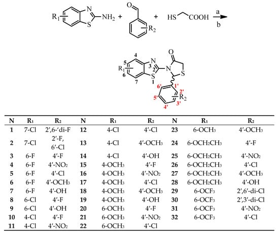Synthesis of the compounds was performed by one pot method according to Scheme 1 [44] and for some compounds by microwave assisted one-pot procedures (Scheme 1). According to conventional method, the mixture of the suitable aminobenzothiazole, substituted benzaldehyde and mercaptoacetic acid was refluxed in toluene for 18–32 h. All products were obtained as racemates in low yield. Instead using microwave assisted one-pot synthetic procedure the reaction time was reduced to 30 min. The final products were obtained in good yield. All synthesized compounds were characterized by TLC and spectroscopic methods (IR, 1H NMR, 13C-NMR and MS for some compounds).