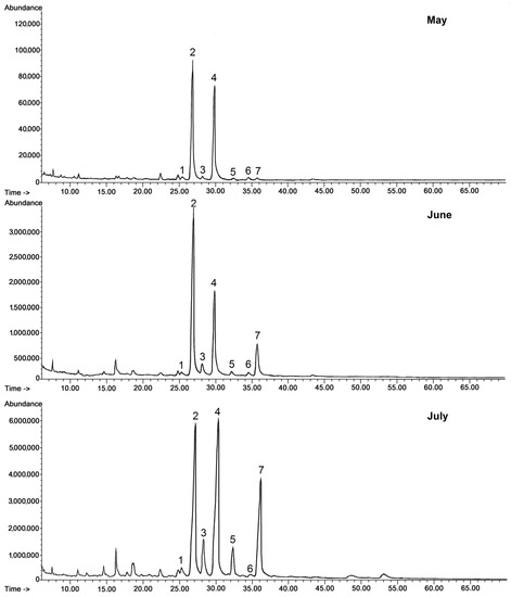 GC-FID chromatograms of the fraction of triterpenoid acids (after methylation) obtained from chloroform extracts of cuticular waxes of bilberry fruit harvested in three developmental stages (young berries in May, unripen full-size berries in mid-June, and ripen berries in early July). Methyl esters of: 1—3-oxo-oleanolic acid, 2—oleanolic acid, 3—3-oxo-ursolic acid, 4—ursolic acid, 5—maslinic acid, 6—corosolic acid, 7—oleanolic acid acetate.