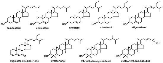 The structures of all the steroids and triterpenoids identified in this study are presented in Figure 4, Figure 5, Figure 6 and Figure 7. Characteristical ions of their mass spectra are presented in Table S1.