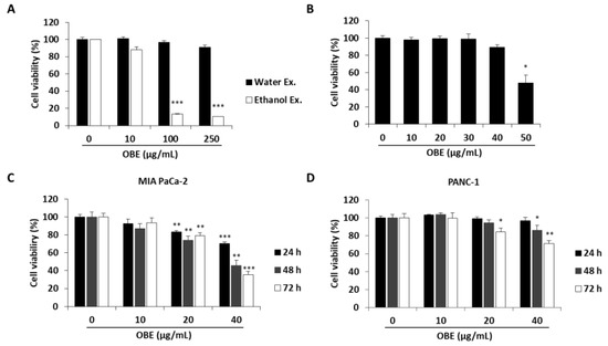 HPNE, MIA PaCa-2, PANC-1, and MIA-Gem cells were seeded in 96-well plates at a density of 5 × 103 cells/well. After stabilization, fresh media with various concentrations of OBE (0–50 µg/mL) was added to the cells. Then, cells were incubated for 24–72 h. Subsequently, 10 µl of water soluble tetrazolium salt (WST-1) reagent was added, and the plates were incubated for another 2 h. Absorbance was measured at 450 nm with a microplate reader. Cell viability was calculated from the mean value of three wells.