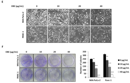To determine the anti-proliferative effect of oat bran water and ethanol extracts, various concentrations of both extracts were used to treat MIA PaCa-2 cells for 72 h. Oat bran ethanol extract (OBE) significantly decreased the survival of MIA PaCa-2 cells, while water extract of the oat bran did not change the cell viability (Figure 1A). hTERT-immortalized human pancreatic epithelial nestin-expressing (HPNE) cells, which are derived from normal pancreatic duct, were treated with OBE for 72 h to investigate the selective cytotoxicity of OBE on the PC cells. At less than 40 µg/mL, OBE showed no cytotoxicity on HPNE cells (Figure 1B). Various concentrations of OBE (0–40 µg/mL) were used to treat PC cell lines including MIA PaCa-2, and PANC-1 for 24–72 h. As seen in WST assay results, OBE inhibited cell viability of PC cells in a dose- and time-dependent manner (Figure 1C,D). Changes to the cell morphology were observed under a microscope after OBE treatment for 72 h (Figure 1E). Additionally, colony formation ability of MIA PaCa-2 and PANC-1 cells was reduced by OBE treatment (Figure 1F). Thus, OBE can selectively suppress growth and colony formation ability of PC cells.