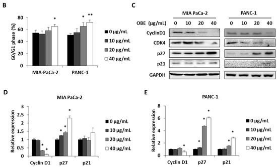 Protein levels of G1/S phase transition regulators were determined to elucidate the mechanism of OBE-induced G0/G1 phase arrest (Figure 2C). Expression of cyclin D1 and CDK4 was decreased by OBE treatment, whereas p21 and p27 expression was increased in both the cell lines (Figure 2D,E). These data showed that OBE can induce cell cycle arrest at the G0/G1 phase of MIA PaCa-2 and PANC-1 cells.