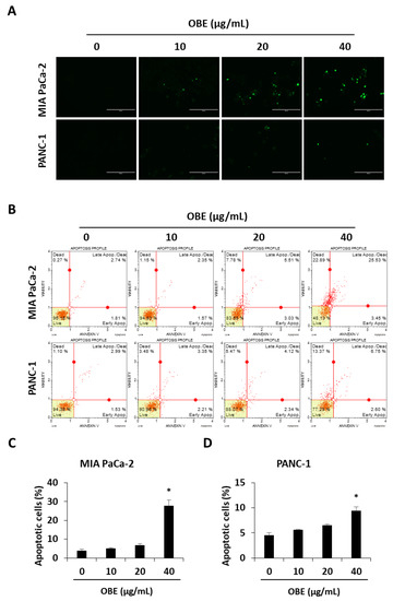 The ability to avoid apoptosis and sustain survival is one of the basic characteristics of cancer cells [20]. Apoptosis is a tightly controlled programmed cell death that can be induced by chemotherapeutic drugs. In this study, it was investigated whether OBE-induced cell death was related to apoptosis in MIA PaCa-2 and PANC-1 cells. OBE treatment increased the TUNEL-positive cells in MIA PaCa-2 and PANC-1 cells in a dose-dependent manner (Figure 3A). AnnexinV/PI staining results showed that the OBE increased apoptosis in MIA PaCa-2 and PANC-1 cells (Figure 3B–D).