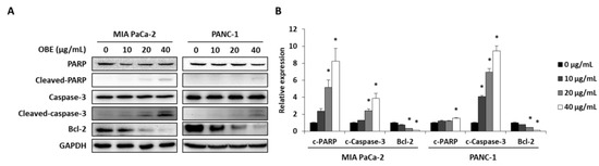 Apoptosis, or programmed cell death, plays a crucial role in the development and maintenance of homeostasis [27]. Various kinds of anti-cancer drugs inhibit cancer progression by directly inducing apoptosis in cancer cells [28]. In apoptotic pathway, caspase-3 plays a crucial role in the activation of apoptosis by cleaving various key cellular proteins including Bcl-2, which normally prevents apoptosis in cancer cells [29]. Cleavage of the Bcl-2 protein can promote further activation of caspases, which ultimately leads to apoptotic cell death [30,31]. PARP, which can repair damaged DNA, is also cleaved and loses its function when the caspases are degraded [31,32]. In the present study, OBE induced apoptosis in MIA PaCa-2 and PANC-1 cells through the induction caspase-3 and PARP cleavage and by reducing Bcl-2 expression.