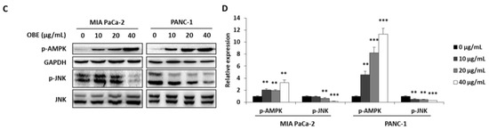 Effect of OBE on apoptosis-related proteins in MIA PaCa-2 and PANC-1 cells. MIA PaCa-2 and PANC-1 cells treated with OBE for 72 h were harvested and target proteins were detected by western blotting. (A) Apoptosis-related proteins in OBE-treated PC cells. (B) Density of apoptosis-related proteins band was analyzed by Image J. (C) Phosphorylation of AMPK and JNK in OBE-treated PC cells. (D) Density of AMPK and JNK phosphorylation band was determined by Image J. Data represent the mean of three experiments analyzed through Student’s t-test. * p < 0.05, ** p < 0.01, and *** p < 0.001.